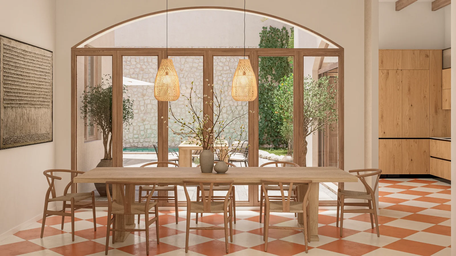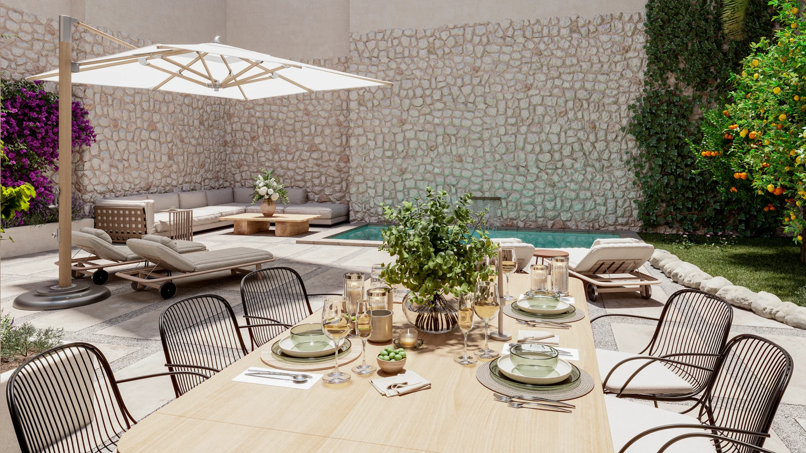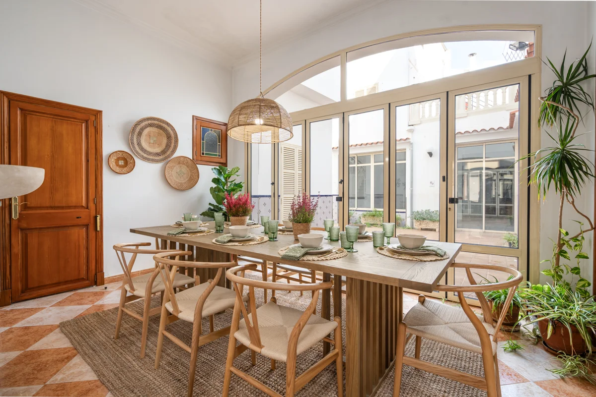 Beim Betreten der Immobilie empfängt Sie der große Innenhof, ein einzigartiger Bereich, der Ruhe und mediterranen Charme ausstrahlt – ideal für einen Essbereich oder entspannte Begegnungen mit Ausblick nach außen.